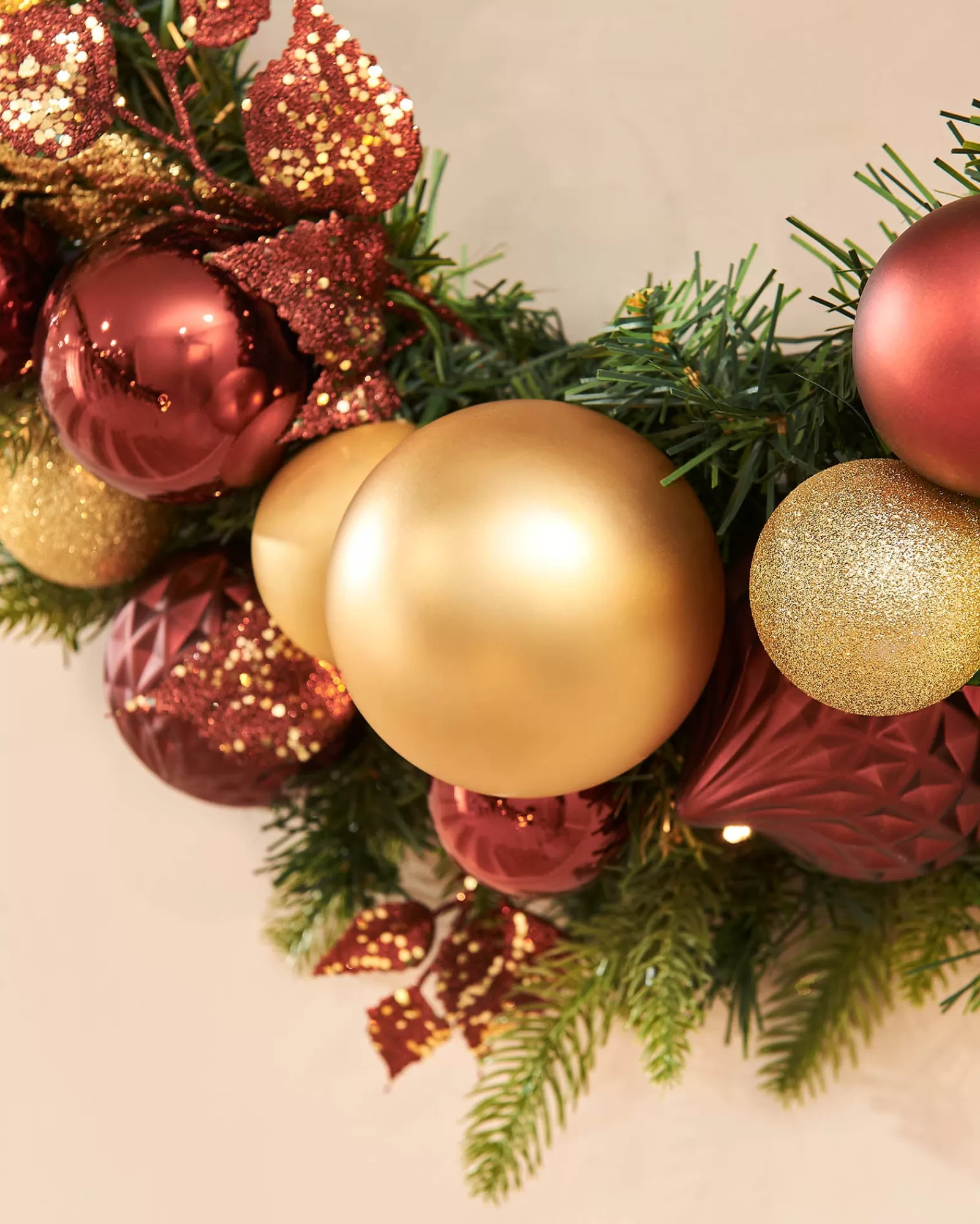 Illuminate Your Home with Elegance with Our Pre-Lit Decorated Wreath, Burgundy/Gold, 76 cm for a Festive Touch of Luxury!