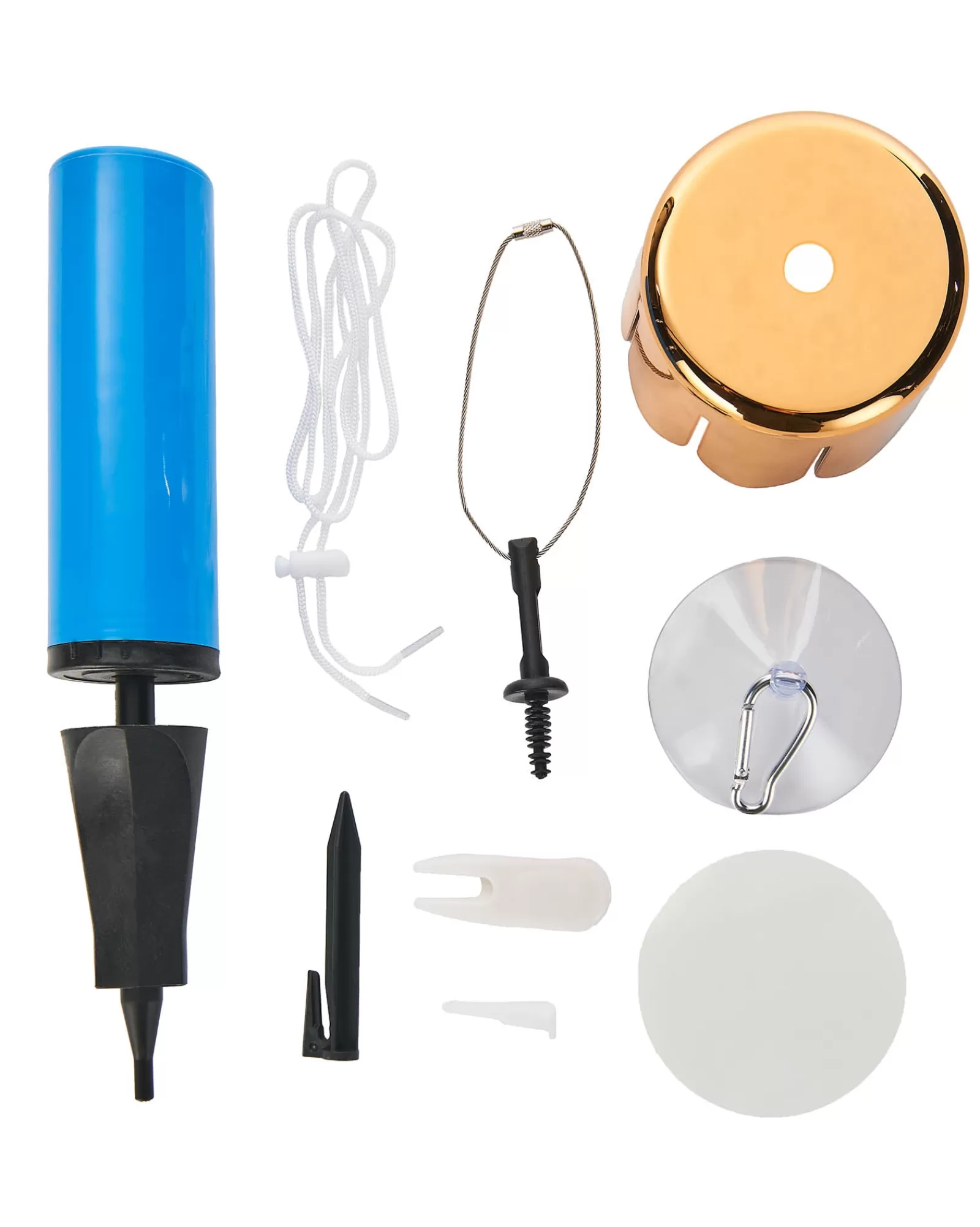 This set is comprehensive and includes everything needed for setup and display. A handy air pump allows for quick inflation, while a suction cap with a steel buckle offers alternative hanging solutions. The set also includes a white hanging rope, which attaches to the buckle, forming a loop for easy adjustment and placement. For secure outdoor installation, a plastic stake is provided, ensuring the bauble stays grounded.