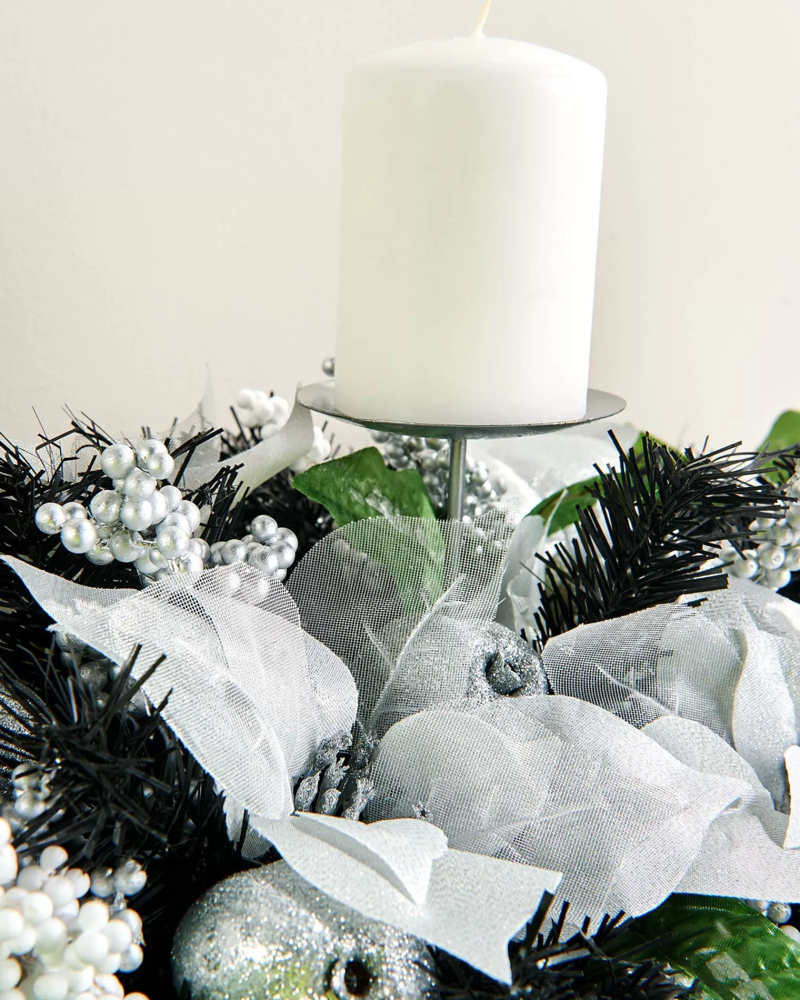 Decorated with stunning silver baubles, foliage and poinsettia, pair this centrepiece with pillar candles for an ambient lighting experience. A wonderful addition to your décor, this table accessory ties your place settings together for truly magical moments.